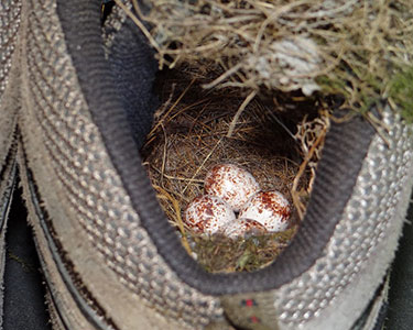 I have a wren who made a nest in a flower pot on the front porch. Since I am moving soon, I transferred it to a snug cardboard box of the same height, making sure it is secure, elevated, and safe from rain. A few days later, egg-laying began, and today I think the incubation period has started, with 4 or maybe 5 eggs. The eggs look exactly like the ones in the hanging boot picture. I live in central Virginia in the country. I’m excited to have a nesting bird!