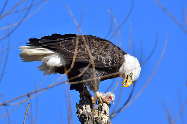 - Lead poisoning: Lead poisoning is a widespread bird problem in North America. Although bald eagles feed mostly on fish, they are opportunistic and eat carrion when this is available. Eagles consume carcasses of game animals shot but not recovered by hunters or gut piles left behind. Vultures, crows, bald eagles, and other scavengers ingest fragments of lead ammunition mixed with the meat. Depending on the amount of lead ingested, a bald eagle can get mildly sick or die from lead poisoning. The University of Minnesota’s Raptor Center estimated that between 21% to 25% of sick eagles treated at the center were found to have lead in their blood at toxic levels.