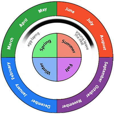 Across the species range, golden eagles begin laying eggs around the same time. However, in migratory populations, pre-breeding courtship displays, nest building, and post-fledging periods must be fit in about 5 months.