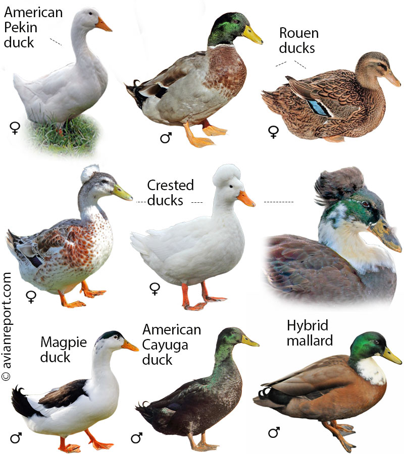 Crested Ducks: Look like other domestic mallard types but feature a distinctive puffball of feathers on their heads.