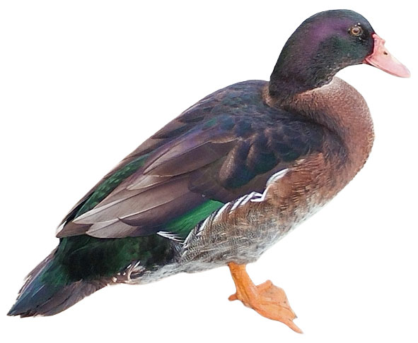 American Cayuga Duck: An American breed known for its striking black-green iridescent feathers and excellent meat. The drakes have the characteristic curly tail feather of mallard descendants.