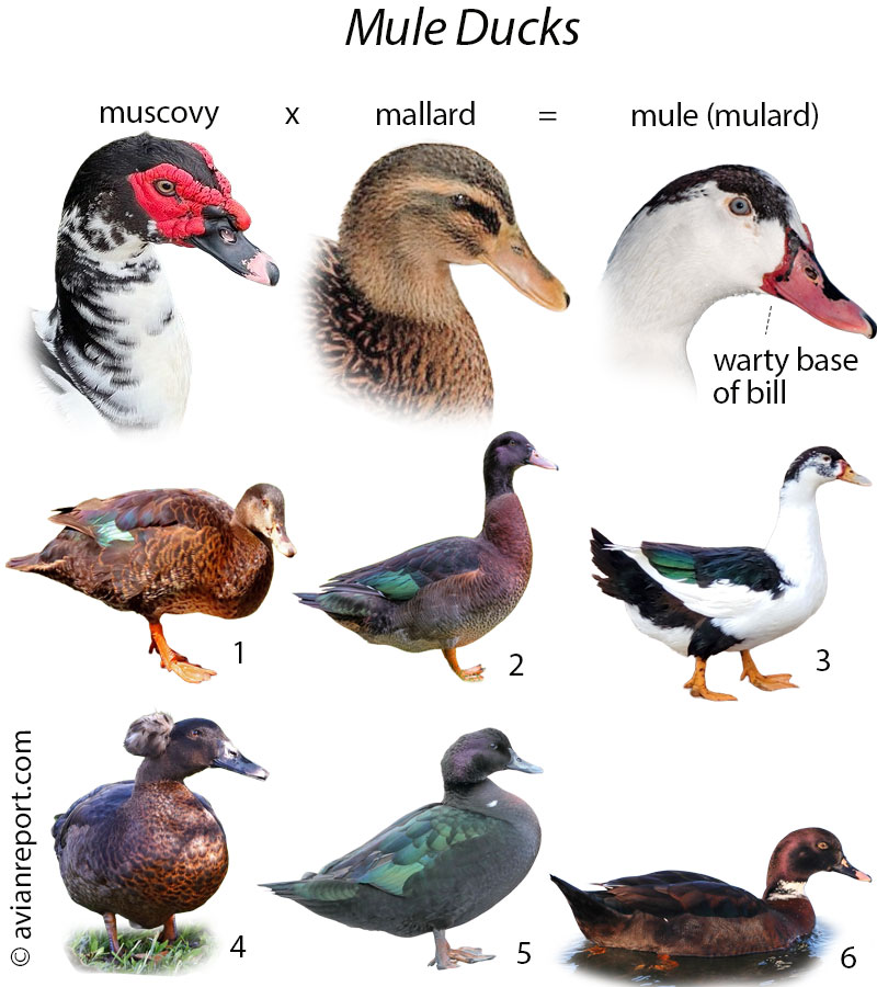 The Mule Duck (often sold commercially as a Mulard) is a sterile hybrid resulting from the cross between a male Muscovy Duck and a female Domestic Mallard. A far less common is the cross breeding of a male Mallard and female Muscovy, often known as Hinny Duck.