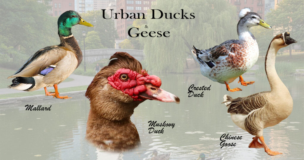 This group includes the wild species that successfully inhabit urban green spaces and wetlands. Differentiating the true wild Mallard from its domestic cousins requires noticing its slender, smaller body and the lack of exaggerated colors or size that characterize farm breeds (see above).