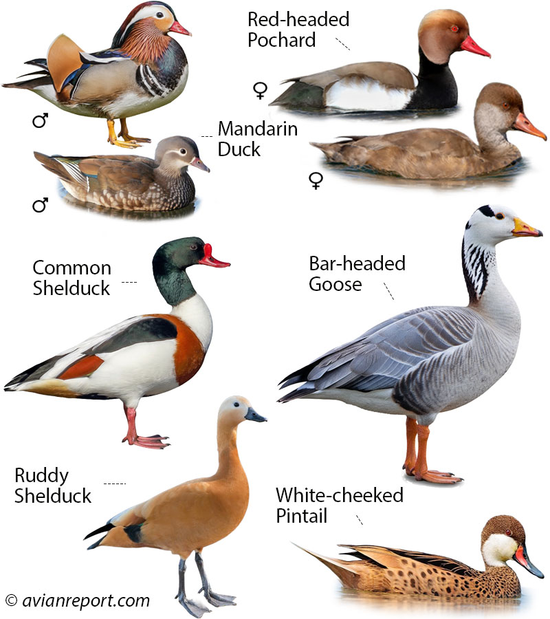 - Exotic Species (Escapees): These are non-native birds that have escaped or been released from zoos, parks, or private collections—such as the Mandarin Duck or Bar-headed Goose. Some fail to survive and disappear, others persist as scattered individuals or small groups, and a few have established self-sustaining (feral or naturalized) populations in parts of North America and elsewhere.
