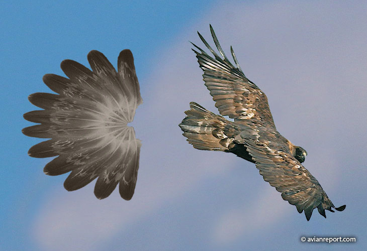 During the third year, young golden eagles initiate a partial replacement of the primary and secondary flight feathers. The third-year wing feathers include two generations of flight feathers; juvenile and newly grown feathers. Fresh flight feathers can be visually separated from juvenile feathers by being slightly shorter.