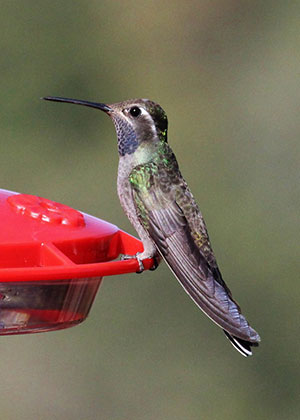 The design and placement of the feeder can influence which species visit and the frequency of visits. For example, some hummingbirds feeders have perches and others don’t. As a general rule, larger species tend to cling to flowers while obtaining nectar. Larger hummingbirds favor feeders with perches.