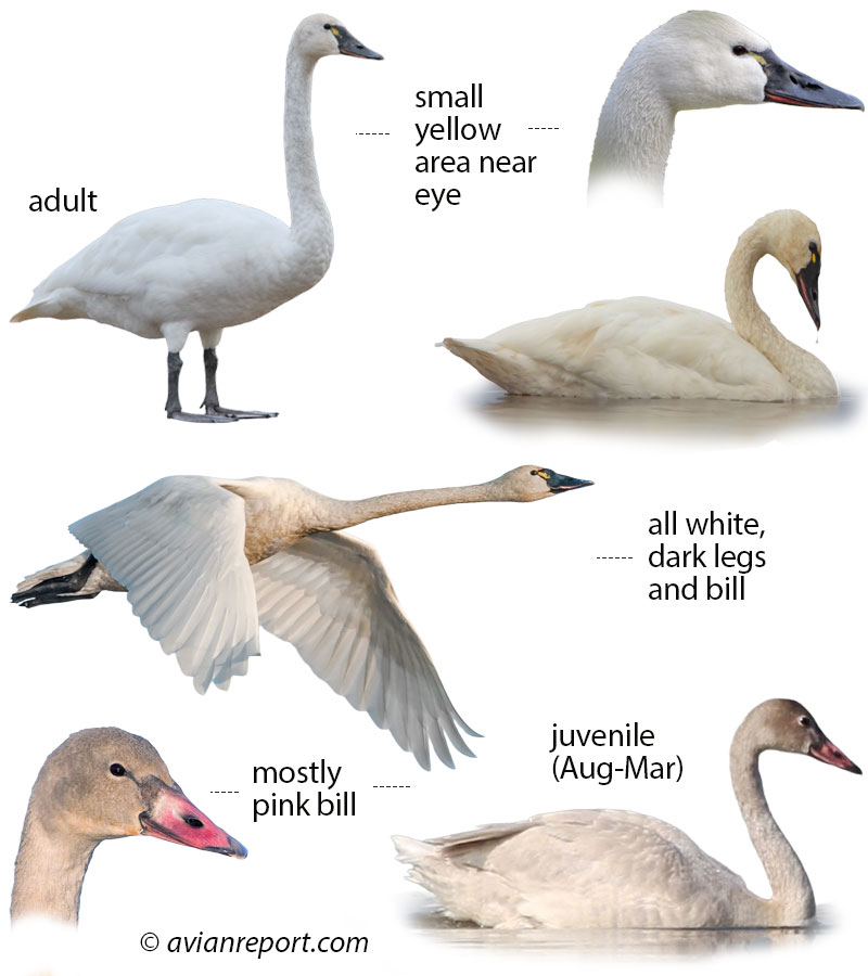 Compare: Tundra Swans are smaller than Mute Swans with a black (not orange) bill. They often hold their neck straighter than Mute Swans.