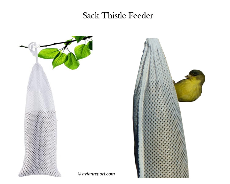 - Sack Feeder: Fabric sock with a mesh body that allows access to nyjer seed for finches but keeps it contained. Seeds naturally sift down to fill the feeding area.