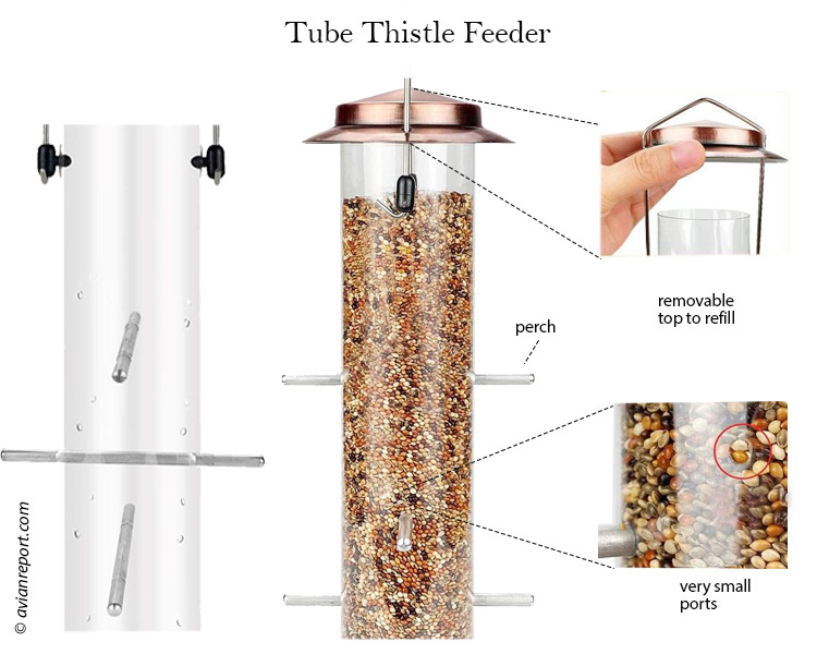 - Tube Feeder: Clear plastic tube with small feeding ports that dispense nyjer seed. Ideal for perching and feeding for finches, while excluding larger birds.